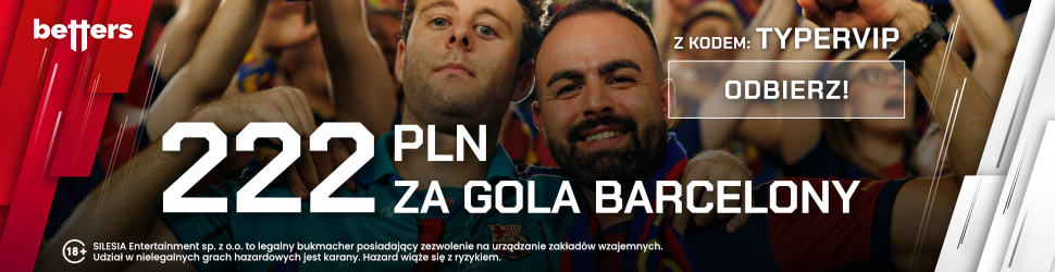 Promocja obowiązuje w dniach od 27.02 godz. 12:00 do 28.02.2026, do 16:15. Należy założyć konto u bukmachera Betters z kodem TYPERVIP i wyrazić wszystkie zgody marketingowe. Kolejno wpłać depozyt, wynoszący min. 50 PLN, a następnie zagraj kupon za stawkę wynoszącą minimum 2 PLN. Kupon musi być zakładem typu SOLO. Na kuponie musi znaleźć się dowolne zdarzenie z kursem min. 1.14 z meczu Barcelona vs Villarreal. Jeśli Barcelona strzeli otrzymasz bonus 222 PLN.