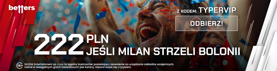 Promocja obowiązuje w dniach od 02.02 godz. 12:00 do 03.02.2026, do 20:45. Należy założyć konto u bukmachera Betters z kodem TYPERVIP i wyrazić wszystkie zgody marketingowe. Kolejno wpłać depozyt, wynoszący min. 50 PLN, a następnie zagraj kupon za stawkę wynoszącą minimum 2 PLN. Kupon musi być zakładem typu SOLO. Na kuponie musi znaleźć się typ na gola Milanu z Bologną („AC Milan. Strzeli gola – Tak” lub „Suma goli. AC Milan – powyżej 0.5”). Jeśli kupon okaże się trafiony otrzymasz bonus 222 PLN.