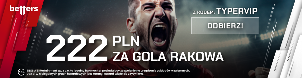 Z okazji meczu Rakowa Częstochowa z Fiorentiną bukmacher Betters przygotował dla nowych graczy rejestrujących się z kodem TYPERVIP bonus 222 PLN za gola Rakowa!