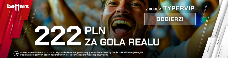 Promocja obowiązuje w dniach od 05.03 godz. 12:00 do 06.03.2026, do 21:00. Należy założyć konto u bukmachera Betters z kodem TYPERVIP i wyrazić wszystkie zgody marketingowe. Kolejno wpłać depozyt, wynoszący min. 50 PLN, a następnie zagraj kupon za stawkę wynoszącą minimum 2 PLN. Kupon musi być zakładem typu SOLO. Na kuponie musi znaleźć się dowolny typ z kursem min. 1.14 z meczu Celta Vigo vs Real Madryt. Jeśli Real Madryt strzeli gola otrzymasz bonus 222 PLN.