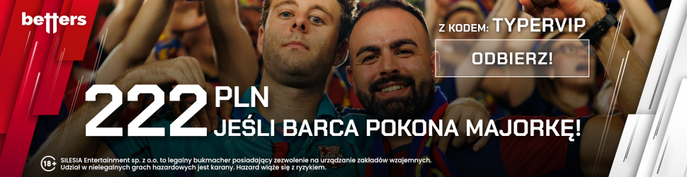 W sobotę w La Liga FC Barcelona zmierzy się u siebie z Mallorcą. Bukmacher Betters z okazji tego spotkania przygotował specjalną promocję, w ramach której do zgarnięcia jest bonus 222 PLN za wygraną Barcelony!