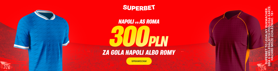 W niedzielę w hicie 25. kolejki Serie A dojdzie do spotkania Napoli z AS Romą. Z tej okazji Superbet przygotował dla nowych graczy rejestrujących konto z kodem TYPERVIP bonus 300 PLN za wytypowanie drużyny z golem!