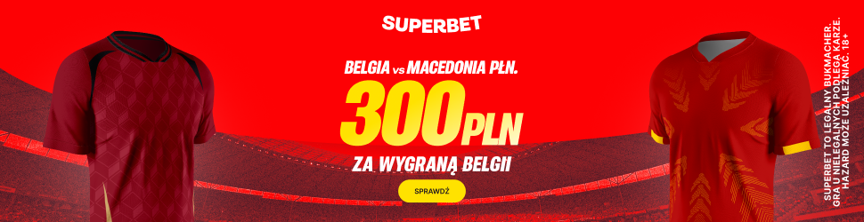W piątek czeka nas wiele ciekawych spotkań w ramach kwalifikacji do mistrzostw świata. Co prawda nie grają Polacy, ale świetnie zapowiadających się meczów nie brakuje. Superbet postanowił swoją najnowszą promocję poświęcić starciu Belgii z Macedonią Północną. Oferuje atrakcyjny bonus 300 PLN za zwycięstwo Belgów.