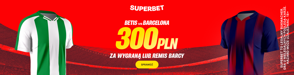 W dniach 04.12 - 06.12.2025, do godziny 18:30, załóż konto u bukmachera Superbet z kodem promocyjnym TYPERVIP i wyraź zgody marketingowe. Później wpłać pierwszy depozyt na min. 50 PLN i zagraj pierwszy kupon przedmeczowy SOLO za stawkę min. 2 PLN (w przypadku wyższej stawki, stawka zaliczana do promocji wynosi 2 PLN). Na kuponie musi znaleźć się typ na zwycięstwo lub remis FC Barcelony z Realem Betis. Jeśli zakład okaże się wygrany, otrzymasz bonus 300 PLN.