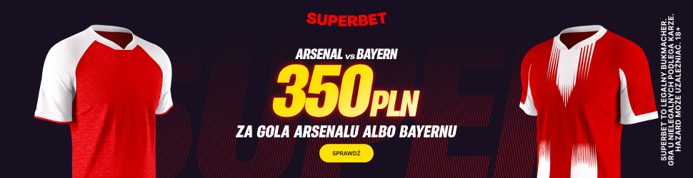 W dniach 24.11 - 26.11.2025, do godziny 20:59, załóż konto u bukmachera Superbet z kodem promocyjnym TYPERVIP i wyraź zgody marketingowe. Kolejno wpłać pierwszy depozyt, wynoszący min. 50 PLN, a następnie zagraj pierwszy kupon przedmeczowy SOLO za stawkę wynoszącą co najmniej 2 PLN (w przypadku wyższej stawki, stawka zaliczana do promocji wynosi 2 PLN). Na kuponie musi znaleźć się typ na gola Bayernu lub Arsenalu (typ zakładu: liczba goli drużyny - Bayern - pow. 0.5 lub Bayern strzeli gola - tak lub liczba goli drużyny - Arsenal - pow. 0.5 lub Arsenal strzeli gola - tak). Jeśli zakład okaże się wygrany otrzymasz bonusowe 350 PLN.