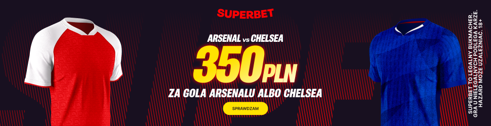 Z okazji hitu 28. kolejki Premier League bukmacher Superbet przygotował dla nowych graczy bonus 350 PLN za wytypowanie drużyny z golem w meczu Arsenal vs Chelsea.