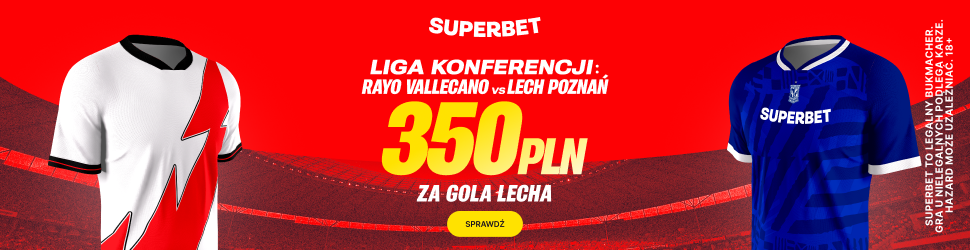 W dniach 04.11 - 06.11.2025, do godziny 20:59, załóż konto u bukmachera Superbet z kodem promocyjnym TYPERVIP i wyraź zgody marketingowe. Kolejno wpłać pierwszy depozyt, wynoszący min. 50 PLN, a następnie zagraj pierwszy kupon przedmeczowy SOLO za stawkę wynoszącą co najmniej 2 PLN (w przypadku wyższej stawki, stawka zaliczana do promocji wynosi 2 PLN). Na kuponie musi znaleźć się typ na gola Lecha Poznań w meczu z Rayo (typ zakładu: Liczba goli drużyny - Lech - pow. 0.5 lub Lech strzeli gola - tak). Jeśli zakład okaże się wygrany otrzymasz bonusowe 350 PLN.