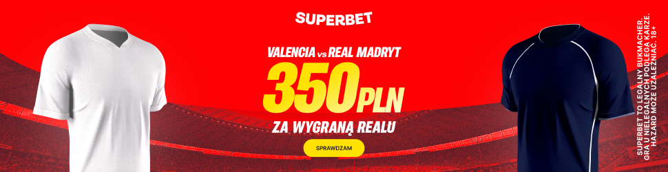 W dniach 05.02 - 08.02.2026, do godziny 20:59, załóż konto u bukmachera Superbet z kodem promocyjnym TYPERVIP i wyraź zgody marketingowe. Kolejno wpłać pierwszy depozyt, wynoszący min. 50 PLN, a następnie zagraj pierwszy kupon przedmeczowy SOLO za stawkę wynoszącą min. 2 PLN (w przypadku wyższej stawki, stawka zaliczana do promocji wynosi 2 PLN). Na kuponie musi znaleźć się typ na wygraną Realu Madryt z Valencią w meczu La Liga (typ zakładu: Mecz - 2). Jeśli zakład okaże się wygrany otrzymasz bonusowe 350 PLN.