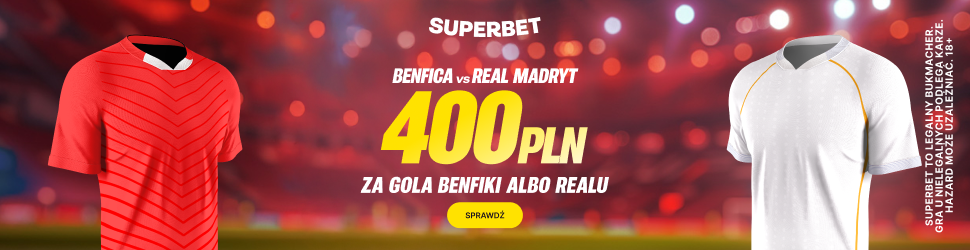 W dniach 16.02 - 17.02.2026, do godziny 20:59, załóż konto u bukmachera Superbet z kodem promocyjnym TYPERVIP i wyraź zgody marketingowe. Kolejno wpłać pierwszy depozyt, wynoszący min. 50 PLN, a następnie zagraj pierwszy kupon przedmeczowy SOLO za stawkę wynoszącą min. 2 PLN (w przypadku wyższej stawki, stawka zaliczana do promocji wynosi 2 PLN). Na kuponie musi znaleźć się typ na gola wybranej drużyny w meczu Benfica vs Real Madryt. Jeśli zakład okaże się wygrany otrzymasz bonusowe 400 PLN.