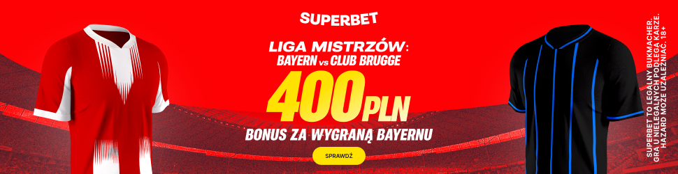 W dniach 20.10 - 22.10.2024, do godziny 21:00, załóż konto u bukmachera Superbet z kodem promocyjnym TYPERVIP i wyraź zgody marketingowe. Kolejno wpłać pierwszy depozyt, wynoszący min. 50 PLN, a następnie zagraj pierwszy kupon przedmeczowy SOLO za stawkę wynoszącą co najmniej 2 PLN (w przypadku wyższej stawki, stawka zaliczana do promocji wynosi 2 PLN). Na kuponie musi znaleźć się typ na wygraną Bayernu Monachium z Club Brugge. Jeśli zakład okaże się wygrany, otrzymasz bonusowe 400 PLN.