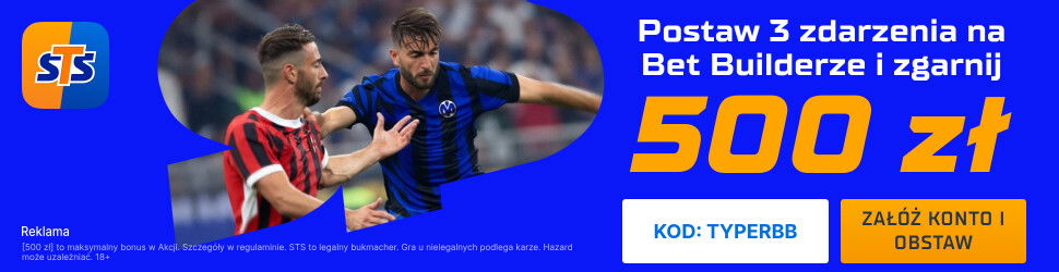 Promocja obowiązuje w dniach 07.03 - 08.03.2026, do 20:44 i jest wyłącznie dla nowych graczy, którzy założą konto u bukmachera STS z kodem TYPERBB. Następnie trzeba wyrazić zgody marketingowe. Później wpłać pierwszy depozyt na min. 50 PLN i zagraj przedmeczowy kupon betbuilder za min. 2 PLN z kursem min. 2.00 i min. 3 zdarzeniami z meczu AC Milan vs Inter Mediolan. W przypadku trafienia otrzymasz 500 PLN bonusu.