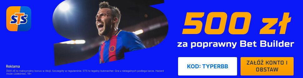 Promocja obowiązuje w dniach 09.04 - 11.04.2026, do 18:29 i jest wyłącznie dla nowych graczy, którzy założą konto u bukmachera STS z kodem TYPERBB. Następnie trzeba wyrazić zgody marketingowe. Później wpłacić pierwszy depozyt na kwotę min. 50 PLN i zagrać przedmeczowy kupon SOLO lub AKO za min. 2 PLN zawierający betbuilder z kursem min. 2.00 i min. 3 zdarzeniami z meczu FC Barcelona vs Espanyol. W przypadku trafienia otrzymasz bonus 500 PLN.