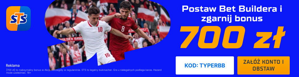 Promocja obowiązuje w dniach 23.03 - 26.03.2026, do 20:44 i jest wyłącznie dla nowych graczy, którzy założą konto u bukmachera STS z kodem TYPERBB. Następnie trzeba wyrazić zgody marketingowe. Później wpłacić pierwszy depozyt na kwotę min. 50 PLN i zagrać przedmeczowy kupon SOLO lub AKO za min. 2 PLN zawierający betbuilder z kursem min. 2.00 i min. 2 zdarzeniami z meczu Polska vs Albania. W przypadku trafienia otrzymasz bonus 700 PLN.