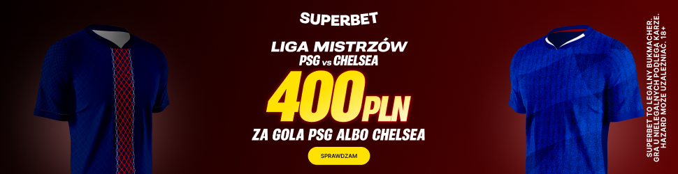 W dniach 09.03 - 11.03.2026, do godziny 20:59, załóż konto u bukmachera Superbet z kodem promocyjnym TYPERVIP i wyraź zgody marketingowe. Kolejno wpłać pierwszy depozyt, wynoszący min. 50 PLN, a następnie zagraj pierwszy kupon przedmeczowy SOLO za stawkę wynoszącą co najmniej 2 PLN (w przypadku wyższej stawki, stawka zaliczana do promocji wynosi 2 PLN). Na kuponie musi znaleźć się typ na gola PSG lub Chelsea (typ zakładu: liczba goli drużyny - PSG - pow. 0.5 lub PSG strzeli gola – tak lub liczba goli drużyny - Chelsea - pow. 0.5 lub Chelsea strzeli gola – tak). Jeśli zakład okaże się wygrany otrzymasz bonusowe 400 PLN.