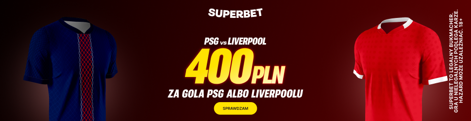 W dniach 07.04 - 08.04.2026, do godziny 20:59, załóż konto u bukmachera Superbet z kodem promocyjnym TYPERVIP i wyraź zgody marketingowe. Kolejno wpłać pierwszy depozyt, wynoszący min. 50 PLN, a następnie zagraj pierwszy kupon przedmeczowy SOLO za stawkę wynoszącą min. 2 PLN (w przypadku wyższej stawki, stawka zaliczana do promocji wynosi 2 PLN). Na kuponie musi znaleźć się typ na gola PSG lub Liverpoolu (typ zakładu: liczba goli drużyny - PSG - pow. 0.5 lub PSG strzeli gola - tak lub liczba goli drużyny - Liverpool - pow. 0.5 lub Liverpool strzeli gola – tak). Jeśli zakład okaże się wygrany otrzymasz bonusowe 400 PLN.