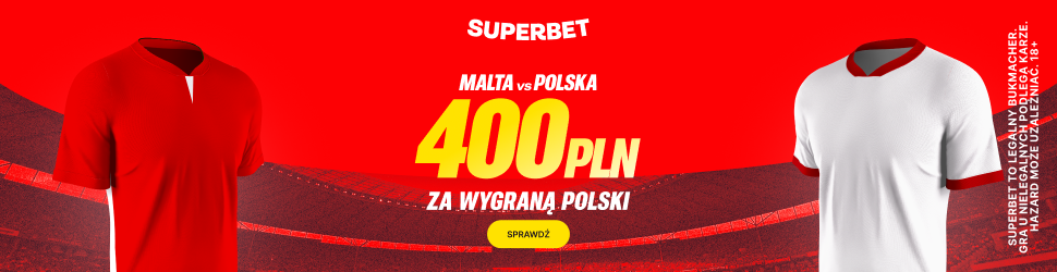 W dniach 14.11 - 17.11.2025, do godziny 20:44, załóż konto u bukmachera Superbet z kodem promocyjnym TYPERVIP i wyraź zgody marketingowe. Kolejno wpłać pierwszy depozyt, wynoszący min. 50 PLN, a następnie zagraj pierwszy kupon przedmeczowy SOLO za stawkę wynoszącą co najmniej 2 PLN (w przypadku wyższej stawki, stawka zaliczana do promocji wynosi 2 PLN). Na kuponie musi znaleźć się typ na wygraną Polski z Maltą (typ zakładu: Mecz - 2). Jeśli zakład okaże się wygrany otrzymasz bonusowe 400 PLN.