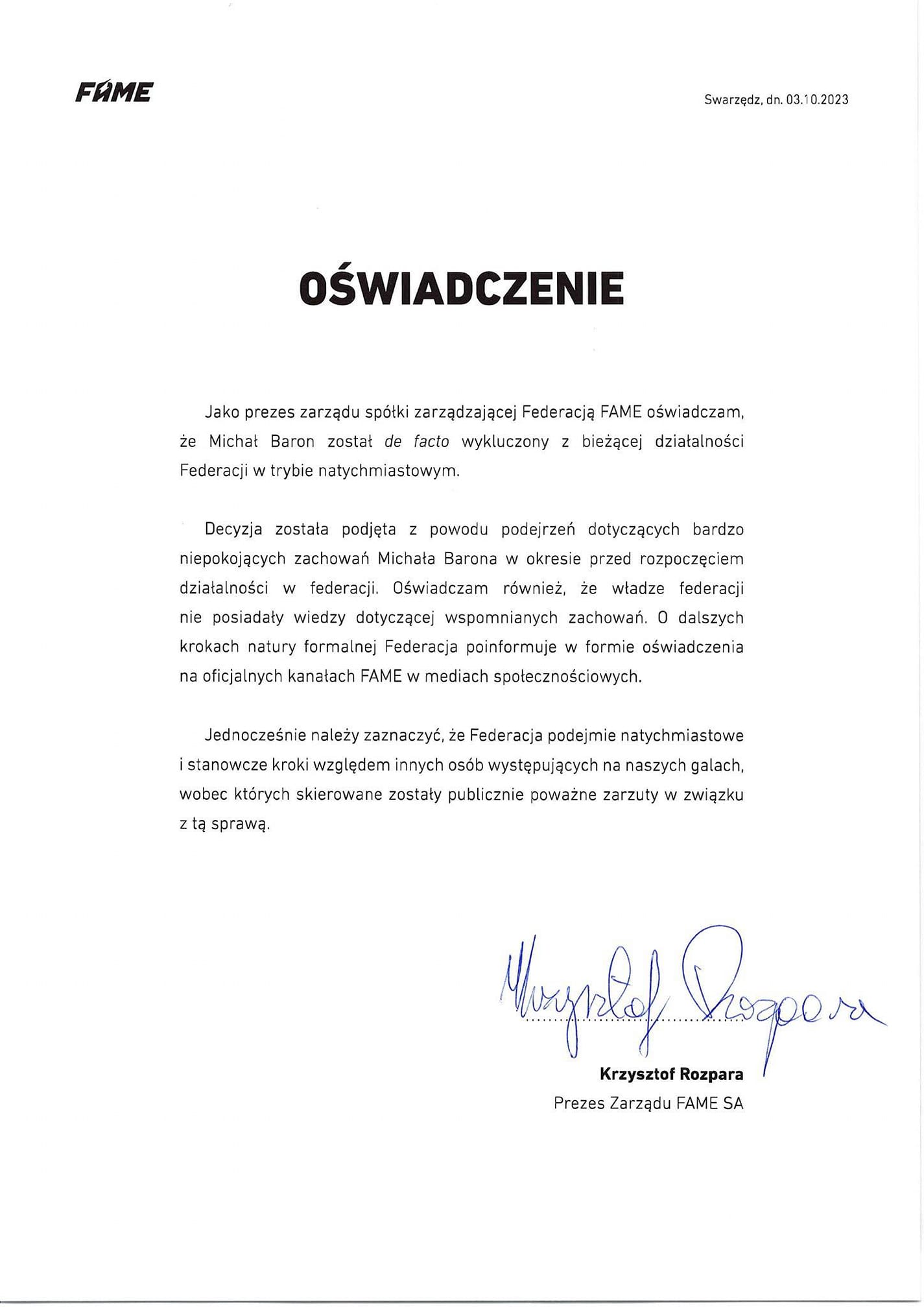Warto podkreślić, że organizacja podejmie również natychmiastowe kroki względem innych osób, wobec których zostały skierowane podobne zarzuty. Jak możemy się domyślać, w oktagonie FAME MMA nie zobaczymy już Dubiela.