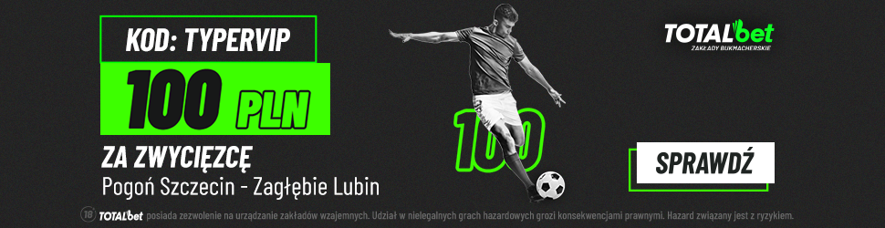 W poniedziałek w meczu zamykającym 16. kolejkę Ekstraklasy Pogoń Szczecin zmierzy się z Zagłębiem Lubin. Z tej okazji TOTALbet przygotował promocję, w ramach której do zgarnięcia jest freebet 100 PLN za wytypowanie zwycięzcy tego spotkania.