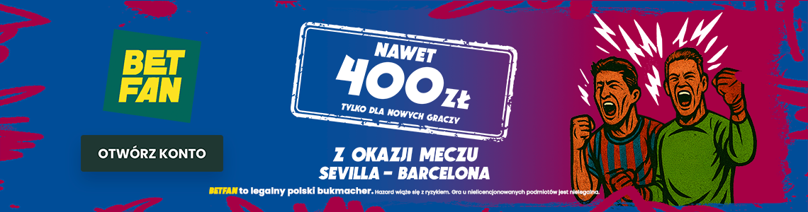 W niedzielę w 8. kolejce LaLiga FC Barcelona zmierzy się na wyjeździe z Sevillą. Specjalnie na to spotkanie bukmacher Betfan przygotował promocję, w ramach której do zgarnięcia jest freebet do 400 PLN za określone boiskowe wydarzenia.