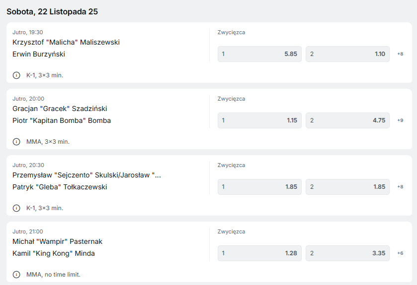 Zostaniesz przekierowany do oferty z wszystkimi walkami i aktualnymi kursami na zawodników FAME MMA 28 - Krok 4