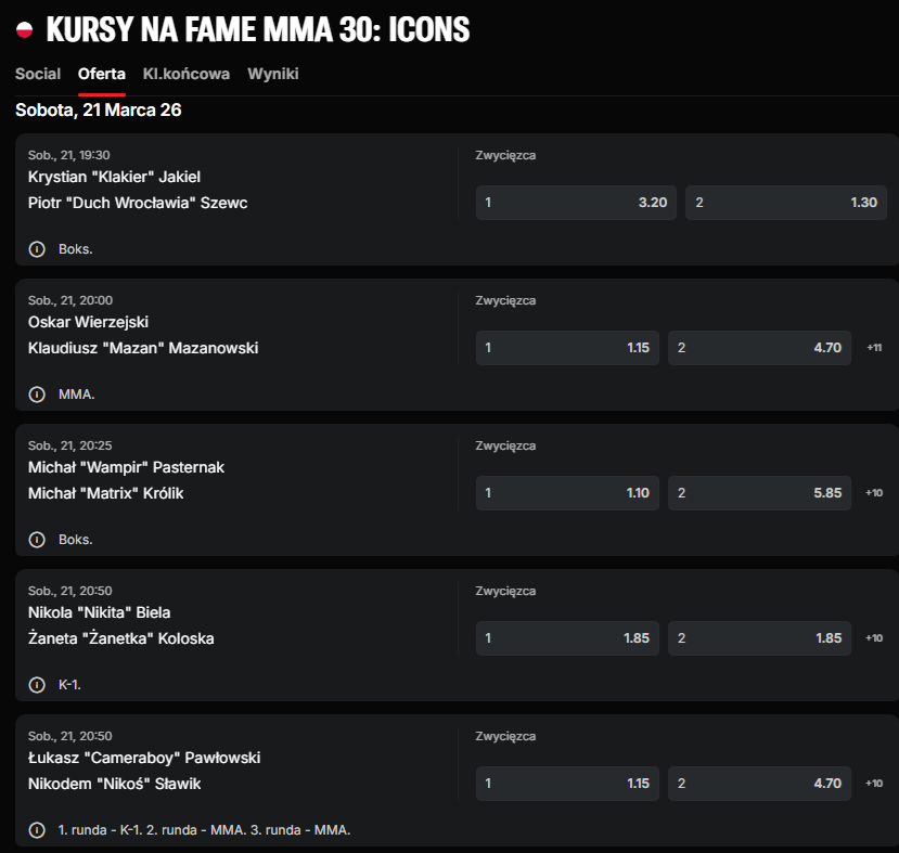 Zostaniesz przekierowany do oferty z wszystkimi walkami i aktualnymi kursami na zawodników FAME MMA 30 - Krok 4